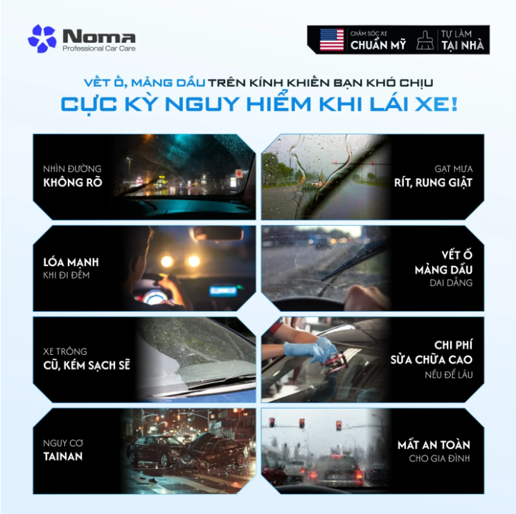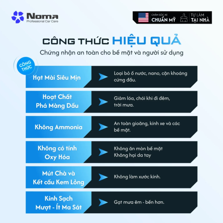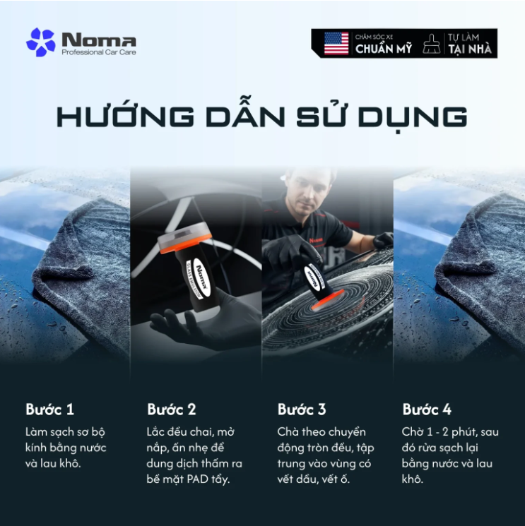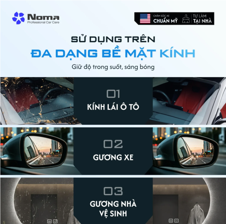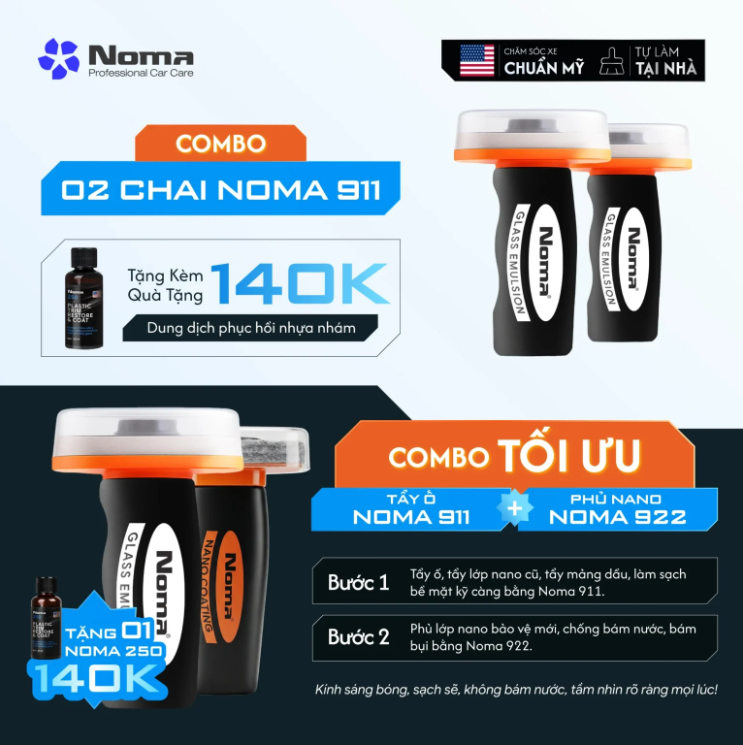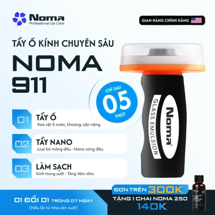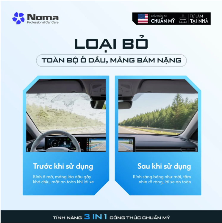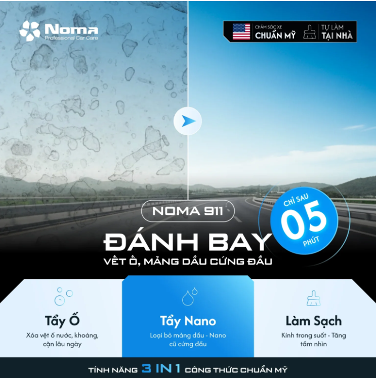Kính lái mờ ố, bám màng dầu khiến tầm nhìn kém và dễ lóa khi đi đêm? Giải pháp là Noma 911 – Tẩy ố kính chuyên sâu. Đây không chỉ là kem tẩy ố kính thông thường; NOMA 911 là sản phẩm kết hợp hai sức mạnh để làm sạch triệt để mọi cặn bẩn cứng đầu và tạo một lớp màng chống bám nước mạnh mẽ. Chỉ cần thoa, chờ, và rửa sạch, bạn sẽ có ngay tầm nhìn trong suốt vượt trội và cần gạt hoạt động êm mượt.