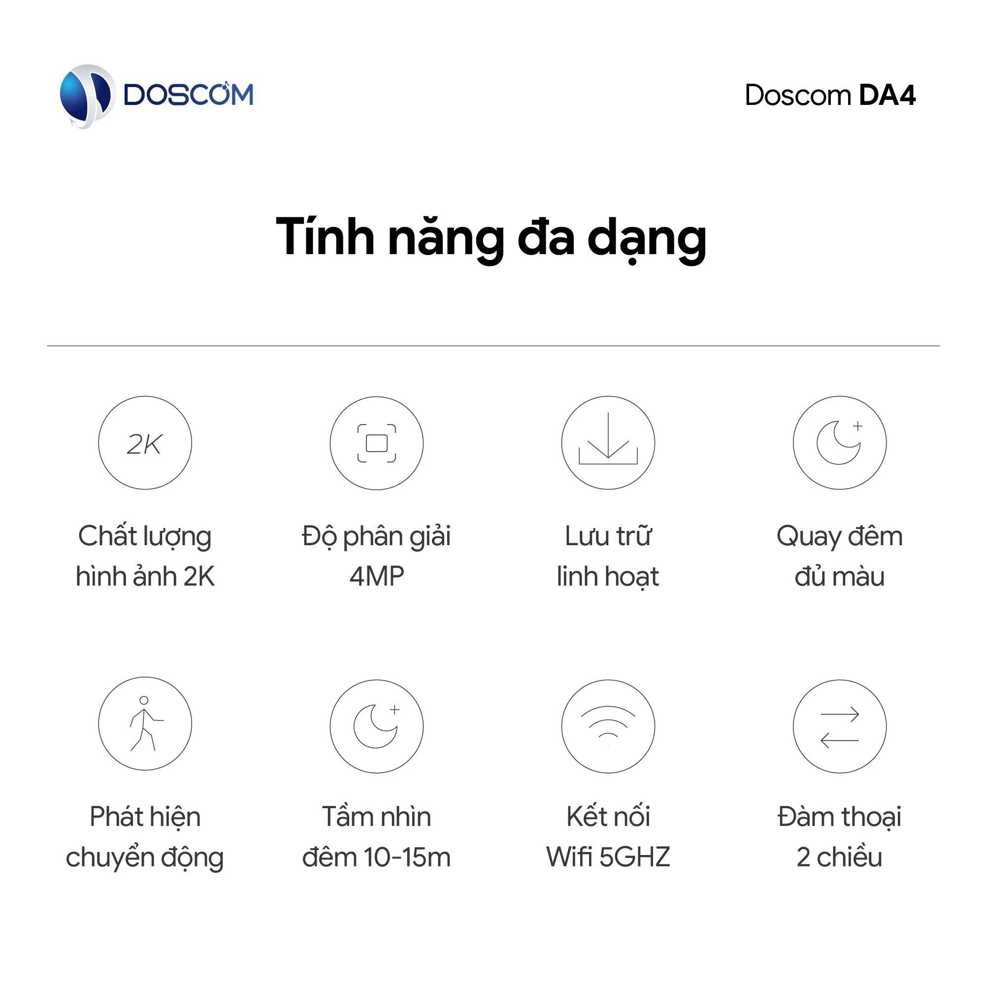 DA4 Doscom được nâng cấp với cảm biến hình ảnh 4MP, cho độ phân giải 2K sắc nét vượt trội. Khi zoom quang học, hình ảnh vẫn giữ nguyên độ chi tiết, không vỡ nát như zoom kỹ thuật số. Bên cạnh đó là Camera Wifi 5GHz DA4 giúp camera quan sát được hình ảnh thời gian thực, rõ nét từng hành động nhỏ trong nhà, lý tưởng cho việc theo dõi em bé, người già, hoặc thú cưng mà không bỏ lỡ bất kỳ khoảnh khắc nào.