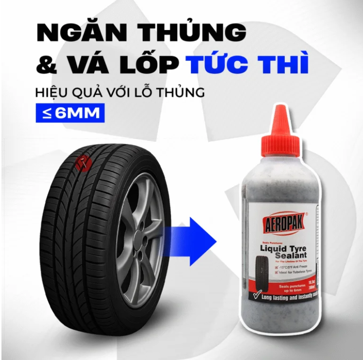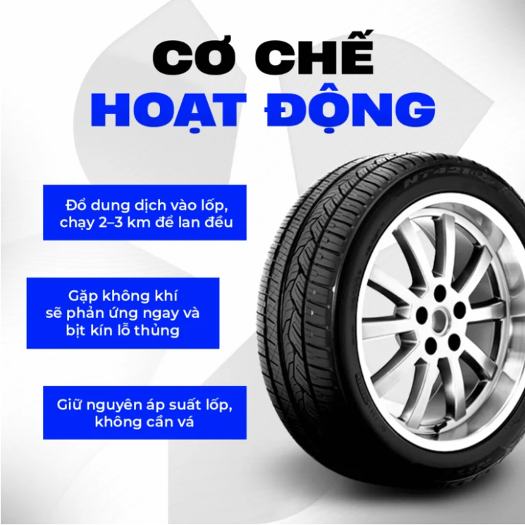Sản phẩm giúp bịt kín nhanh các lỗ thủng nhỏ trên lốp xe, ngăn xì hơi và hạn chế hư hỏng lan rộng. Chỉ cần sử dụng đúng cách, dung dịch sẽ len vào vị trí thủng và tạo lớp bịt kín tức thì.