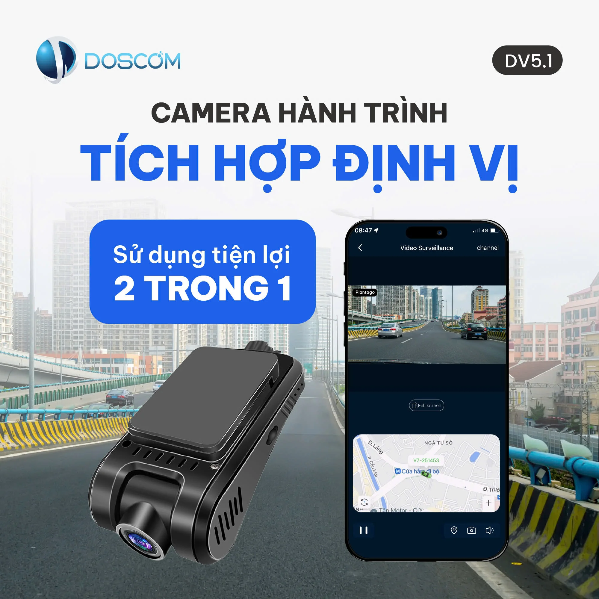 DV5.1 Doscom vừa là camera hành trình giúp giám sát và lưu lại hình ảnh xung quanh xe tiện lợi, đảm bảo lưu trữ đủ thông tin khi cần. Ngoài ra DV5.1 còn tích hợp định vị giúp xác định chính xác vị trí xe thời gian thực, kiểm soát trạng thái xe an toàn.
