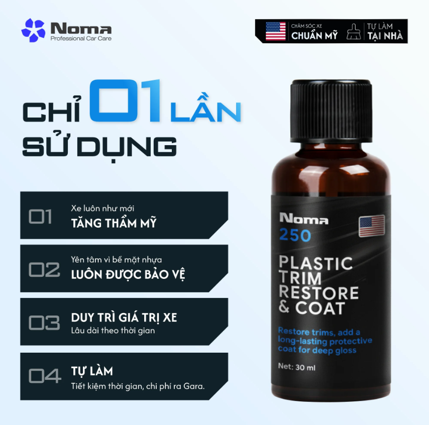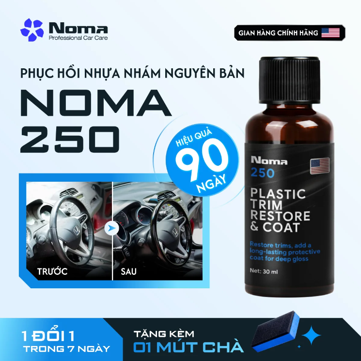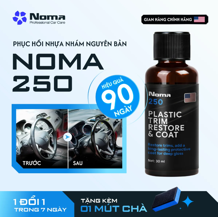NOMA 250 là sản phẩm chăm sóc xe chuyên nghiệp thuộc thương hiệu Mỹ, được thiết kế đặc biệt để phục hồi nhựa nhám nguyên bản trên xe ô tô và xe máy đã bị bạc màu, xám xịt do tác động của thời tiết và tia UV. Dung dịch tạo nên một lớp phủ trong suốt, giúp khôi phục màu đen tự nhiên, tăng cường độ bóng, đồng thời bảo vệ lâu dài khỏi các yếu tố gây hại từ môi trường, giúp chiếc xe lấy lại vẻ ngoài sạch bóng, đen như mới mua.