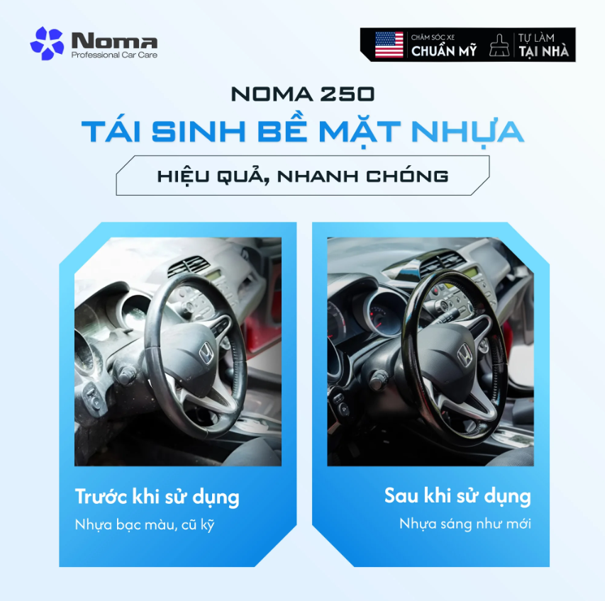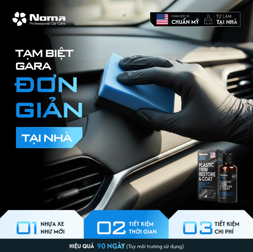 NOMA 250 mang đến giải pháp chăm sóc xe chuẩn Mỹ cực kỳ đơn giản tại nhà, giúp bạn tạm biệt Gara và mọi phiền phức phức tạp. Với quy trình thực hiện nhanh chóng, bạn không chỉ dễ dàng phục hồi nhựa xe về trạng thái như mới mà còn đạt được hiệu quả kéo dài đến 90 ngày (Tùy môi trường sử dụng). Việc tự chăm sóc xe bằng NOMA 250 là lựa chọn thông minh giúp bạn tiết kiệm thời gian và tiết kiệm chi phí đáng kể.