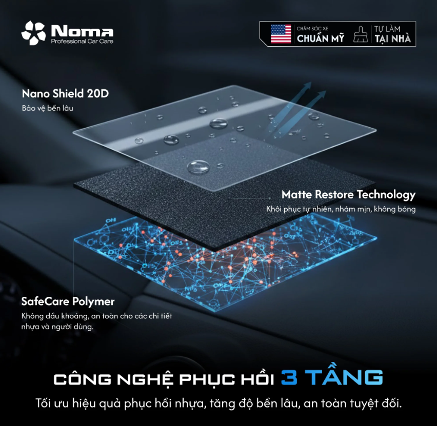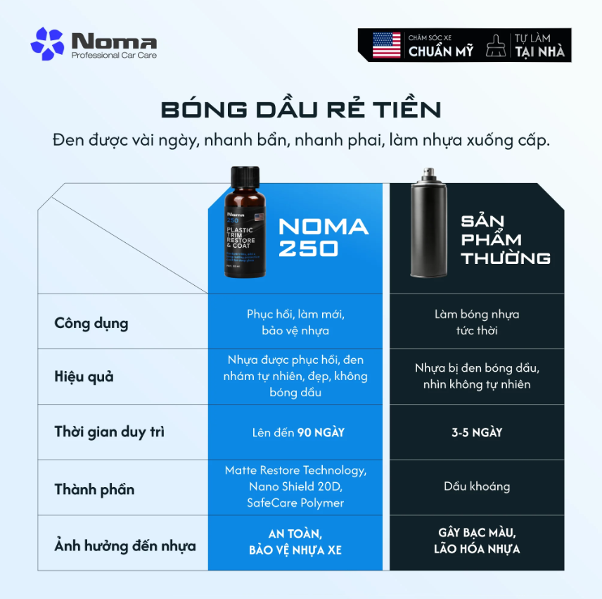 Đừng để những sản phẩm thông thường với thành phần dầu khoáng và hiệu quả tạm thời làm hỏng nhựa xe của bạn! Trong khi các loại xịt thường chỉ tạo ra lớp bóng dầu, dễ bay màu sau 3-5 ngày và có nguy cơ gây bạc màu, lão hóa nhựa về lâu dài, NOMA 250 lại mang đến giải pháp phục hồi, làm mới và bảo vệ toàn diện. Nhờ ứng dụng các công nghệ tiên tiến như Matte Restore Technology và Nano Shield 20D, NOMA 250 không chỉ tái sinh màu đen tự nhiên, không bóng dầu, mà còn tạo lớp bảo vệ an toàn, chống tia UV, giúp duy trì hiệu quả kéo dài lên đến 90 ngày. Lựa chọn NOMA 250 là lựa chọn sự an toàn, thẩm mỹ tự nhiên và độ bền vượt trội cho các chi tiết nhựa xe của bạn