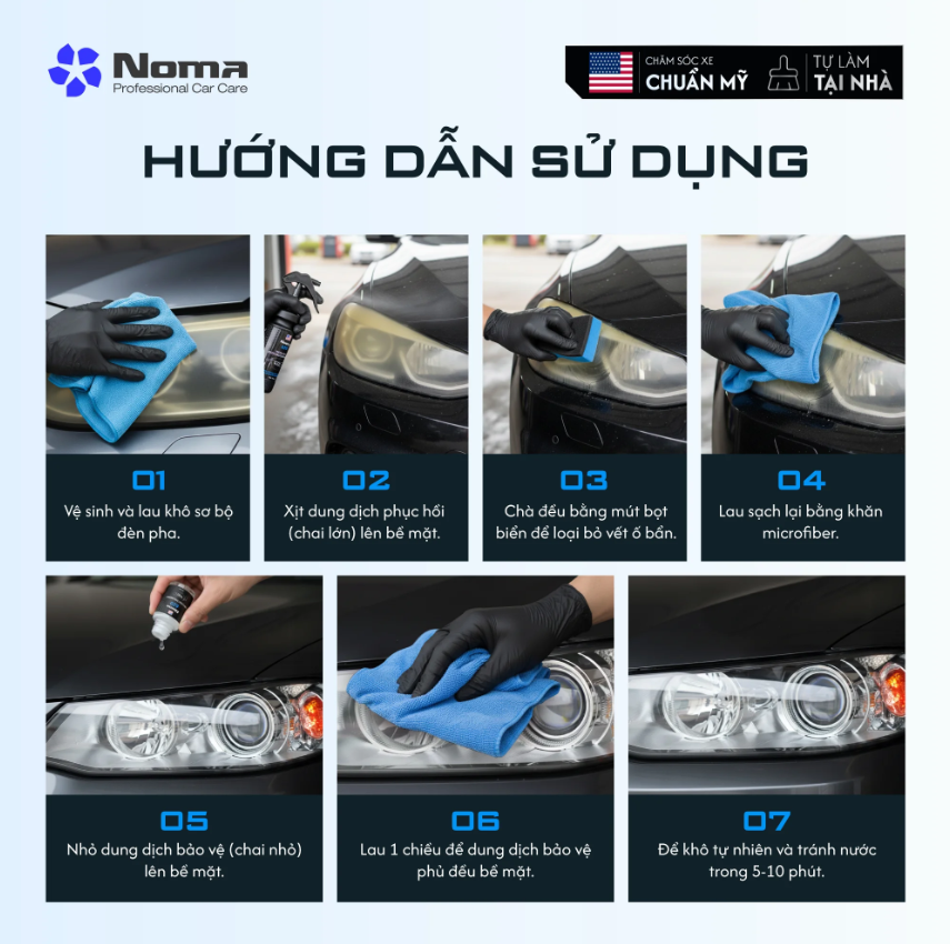“Thực hiện đúng quy trình 7 bước cùng NOMA 620 sẽ giúp đôi đèn pha của bạn khôi phục độ trong suốt và duy trì độ sáng bóng bền bỉ theo thời gian.”