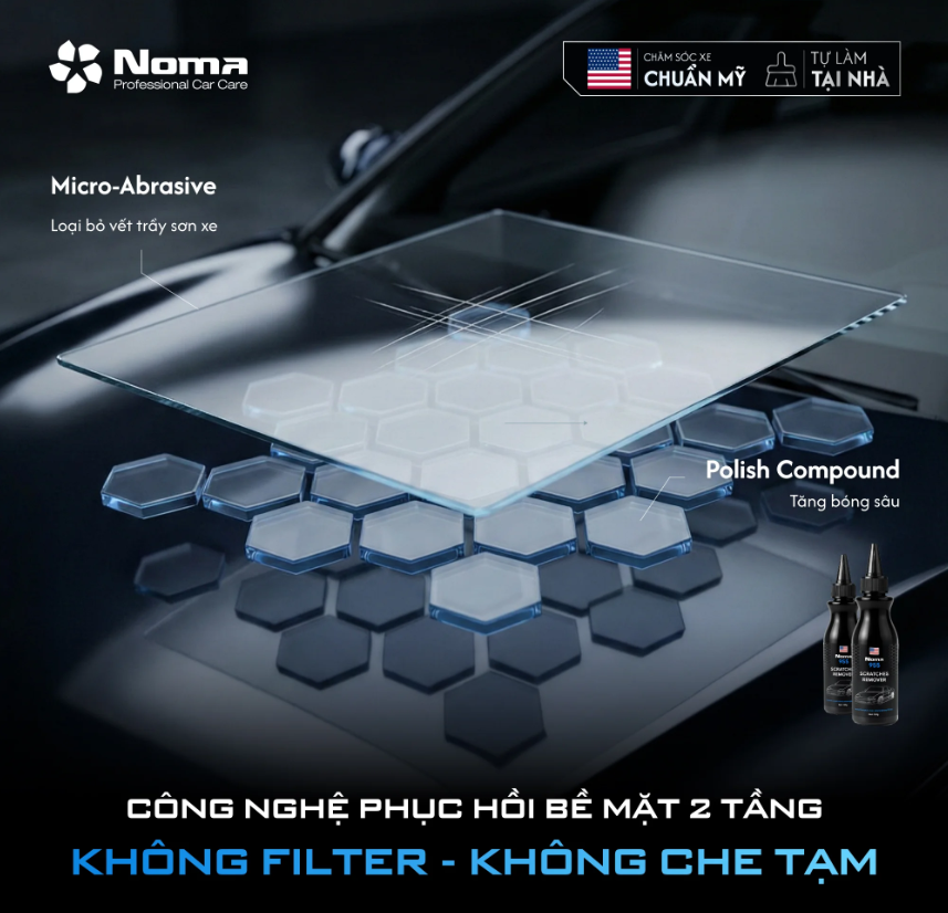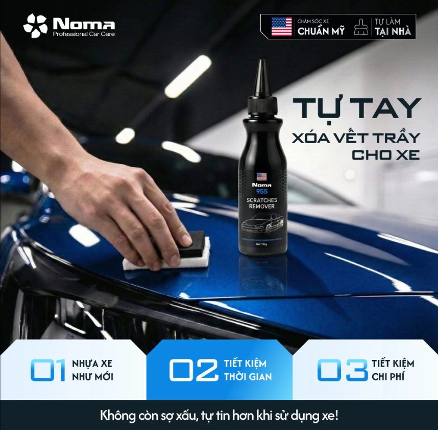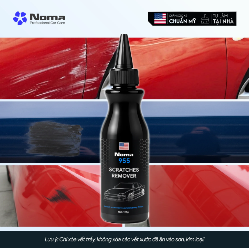 NOMA 955 là dung dịch loại bỏ vết trầy sơn xe và làm mờ vết xước ứng dụng công nghệ Micro-Abrasive an toàn, được thiết kế để người dùng có thể tự chăm sóc xe tại nhà. Sản phẩm hỗ trợ xử lý các vấn đề phổ biến như xước do rửa xe hoặc các vết sơn lạ bám vào bề mặt mà không cần sử dụng máy đánh bóng chuyên dụng. Với công thức tích hợp, dung dịch giúp xóa xước thực chất, tăng độ bóng sâu và để lại lớp Hybrid Wax bảo vệ bề mặt sơn từ 2 đến 4 tuần. Đây là giải pháp hiệu quả giúp bề mặt sơn xe lấy lại trạng thái mịn màng, sáng bóng mà vẫn đảm bảo an toàn cho lớp sơn nguyên bản.