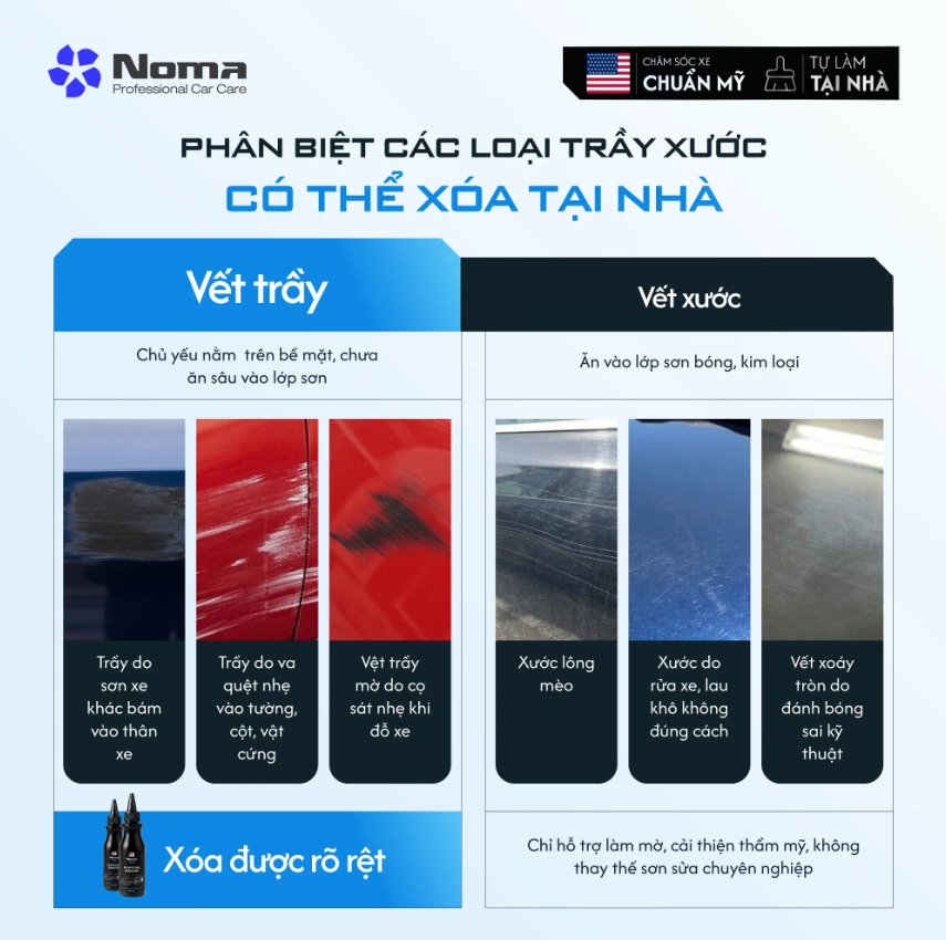 Việc hiểu rõ tình trạng bề mặt sơn là bước quan trọng nhất để đạt hiệu quả tối ưu khi sử dụng NOMA 955 tại nhà. Dưới đây là cách phân biệt các loại trầy xước và khả năng xử lý thực tế của sản phẩm: